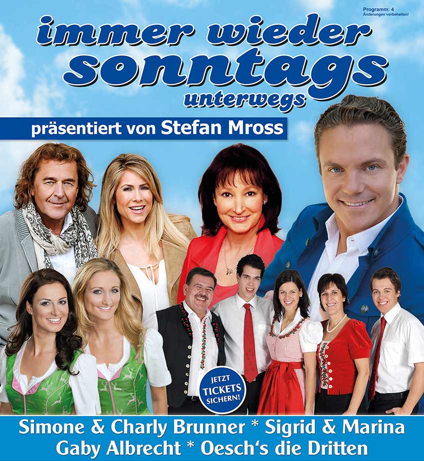 ![]() Die Tournee "Immer wieder sonntags - unterwegs", präsentiert von Stefan Mross, ist nun für dieses Jahr zu Ende. Es war eine wunderbare Zeit. Stefan hat mit seinem unverwechselbaren Humor nicht nur auf der Bühne für gute Laune und gute Stimmung gesorgt. Es war jeden Tag aufs Neue schön, in diesem Programm mitzuwirken. Gemeinsam mit Simone & Charlie Brunner, Oesch's die Dritten, Sigrid & Marina waren wir wieder in über dreißig Städten zu Gast. Ein Dankeschön an alle Kollegen für die Harmonie auf und hinter der Bühne und auch an die Crew, die wieder dafür sorgte, dass alles reibungslos ablief. Für alle weiterhin viel Erfolg und alles Gute. Bis zum nächsten Wiederseh'n viele Grüße Gaby Albrecht |