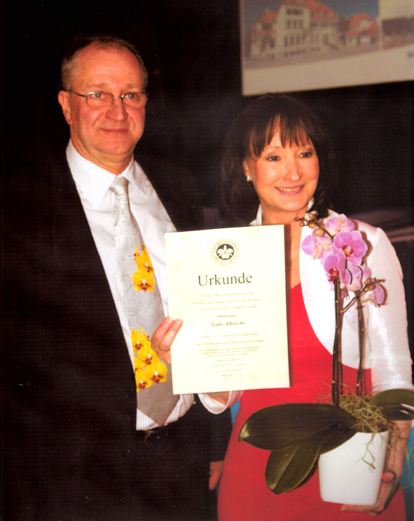 Am Donnerstag, dem 26.3., war ich auf dem Messegelände in Dresden zur Messe"Dresdner Ostern 2015" zu Gast. Blütenreich und wunderschön war die internationale Orchideenschau, die dort in jedem Jahr stattfindet. Herr Treder(siehe Bild) von der Deutschen Orchideen-Gesellschaft e.V. hatte mich zu einer Orchideentaufe eingeladen. Die Moderatorin, Sylvi Piela, leitete unsere lockere Gesprächsrunde und stellte unter anderem einige Fragen an mich. So hatte das Publikum die Gelegenheit, mich nicht nur gesanglich auf der Bühne zu erleben. Dann kam ein ganz besonderer Moment für mich, denn die Orchidee, die von mir getauft wurde, war eine neue Züchtung und erhielt meinen Namen. Es war ein tolles Gefühl und eine besondere Ehre für mich. Es macht mich stolz und glücklich und so möchte ich mich an dieser Stelle recht herzlich bei allen dort Beteiligten bedanken. Vielen Dank auch an das so zahlreich erschienene Dresdner Publikum. Nachtrag: Herzlichen Dank für die Glückwünsche in meinem Gästebuch und die zahlreichen e-mails. Viele Grüße Gaby Albrecht Bild: © MESSE DRESDEN |