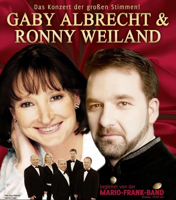 ![]() Am 14. April 2013 fand das "Konzert der großen Stimmen" live begleit von der "Mario-Frank Band" in Ronnys Heimatstadt Apolda in der ausverkauften Lutherkirche statt. Es war einfach wunderbar. Ein Dankeschön an unsere hervorragende Liveband, an Matthias vom Ton und natürlich an das Publikum, an all meine und an Ronny's Fans. Ihr habt uns reichlich mit Applaus verwöhnt. Zum ersten Mal traten bei diesem Konzert zwei außergewöhnliche Stimmen gemeinsam auf und wir hoffen, dass noch viele gemeinsame Auftritt folgen. Gaby Albrecht |