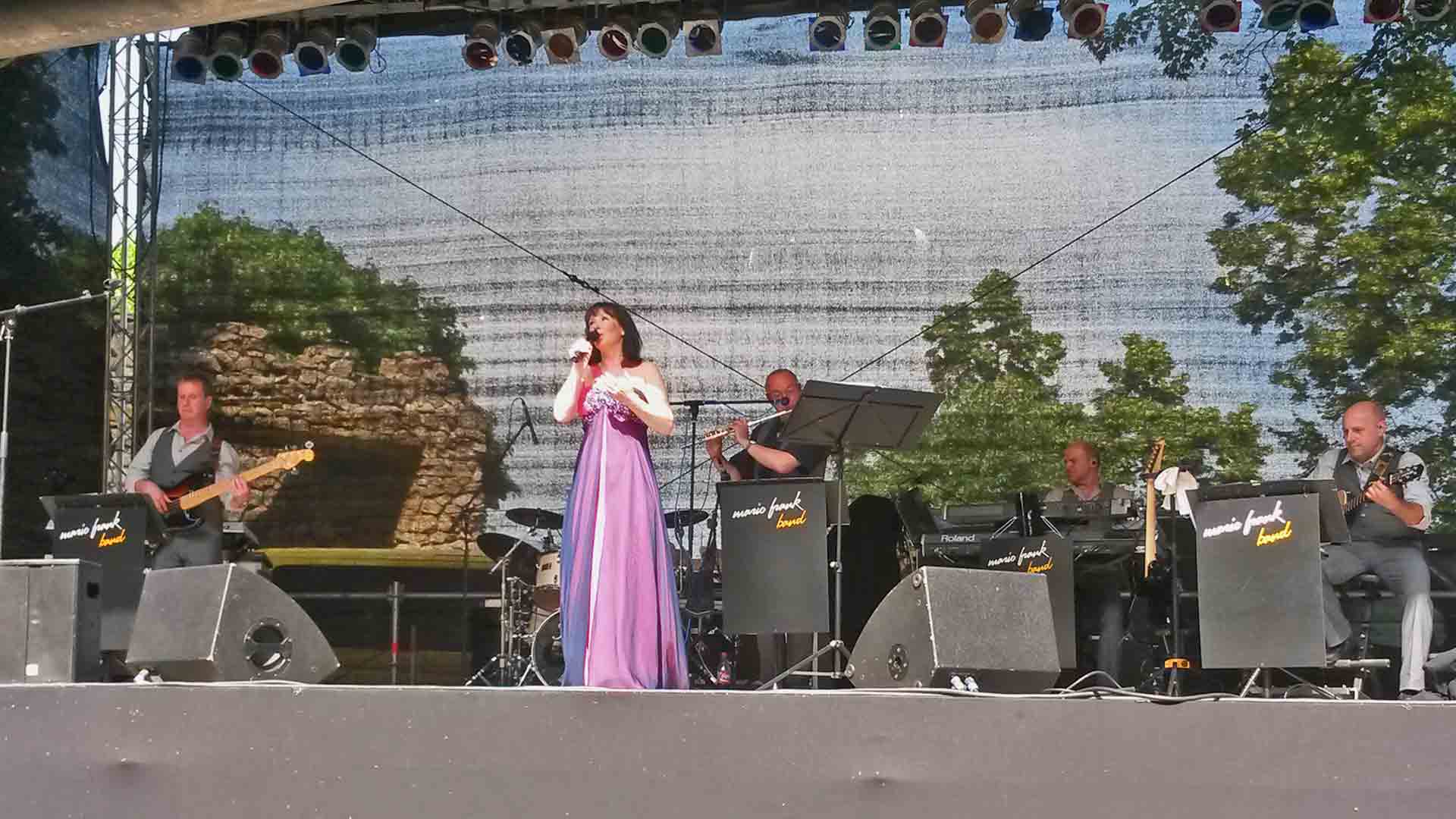 diesem Jahr in zweifacher Hinsicht ganz besonders.Kurz vor Konzertbeginn um die 38°C, dann Gewitterwolken und die Hagelkörner prasselten auf die Zuschauer nieder. Sturm und Regen folgten, aber viele blieben trotzdem sitzen und warteten auf den Konzertbeginn. Mit fünf minütiger Verspätung ging es dann los und voller Unschuld brannte die Sonne wieder erbarmungslos vom Himmel. Das Publikum war von Anfang an gut drauf und unterstützte uns alle mit tollem Applaus. Danke - Ihr wart einfach super und ich hoffe, dass niemand blaue Flecke von den Hagelkörnern oder einen Sonnenbrand bekommen hat. Danke an die Mario-Frank-Band, die mich trotz der großen Hitze excellent begleitet hat. Danke auch an Ronny Weiland, der mir ein bisschen Zeit gab, mich abzukühlen und umzuziehen und der vor allem das Publikum in dieser Zeit hervorragend unterhalten hat. Ohne ihn hätte ich das über zweistündige Konzert bei diesen Temperaturen wohl nicht so gut durchgehalten. Openairkonzerte sind also immer spektakulär und bleiben lange in Erinnerung. Gaby Albrecht |